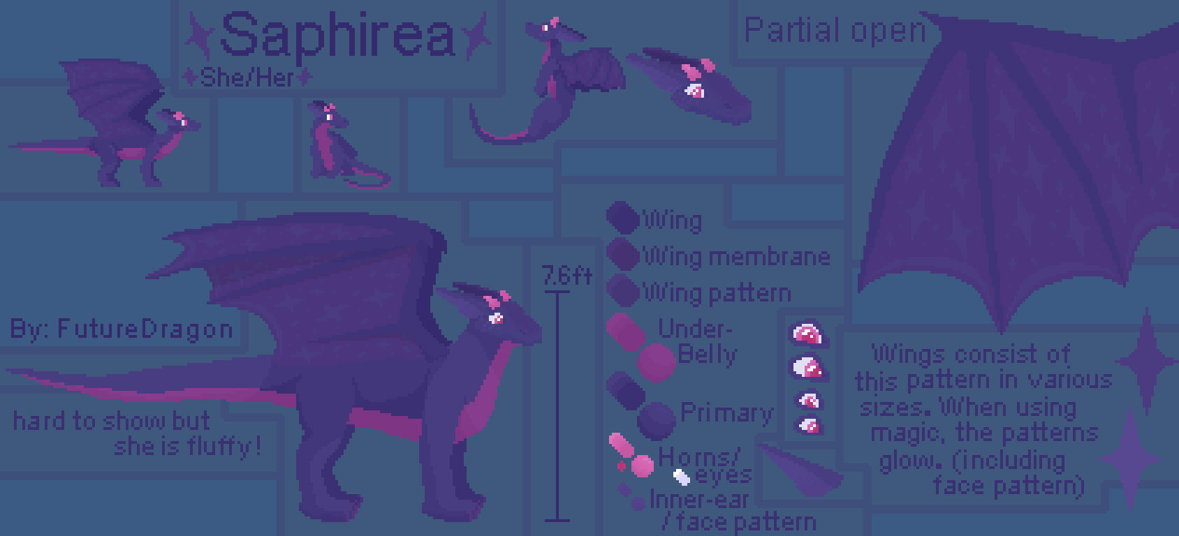 I use her to represent myself online as my profile picture and the primary character I use when representing myself in art. Although I'm a guy so It might change but I really like her character/design so I'm a bit torn. As a character she has her own lore (although not fully written out yet). She also isn't quite my "dragonsona" as she doesn't represent me as a person, she's kind of like a mascot I guess?