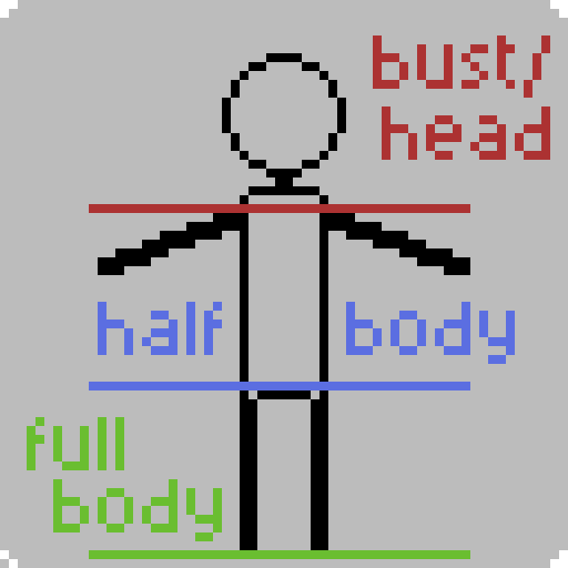 Here's a small visual reference for what I consider bust/head, upper body, and full body (prices aren't based on this, but its useful to know what you want)